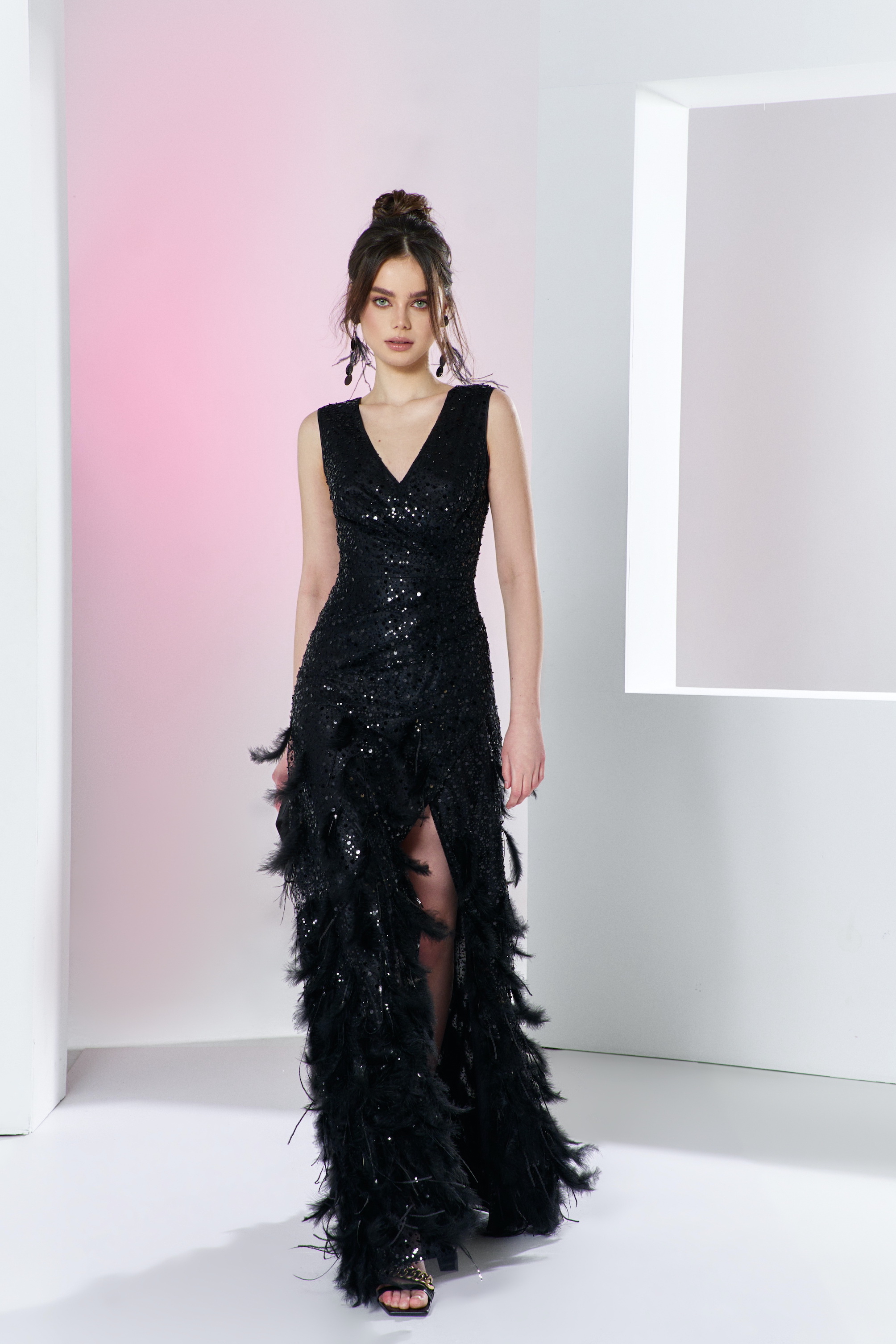 Tüylü siyah parlak gece elbisesi