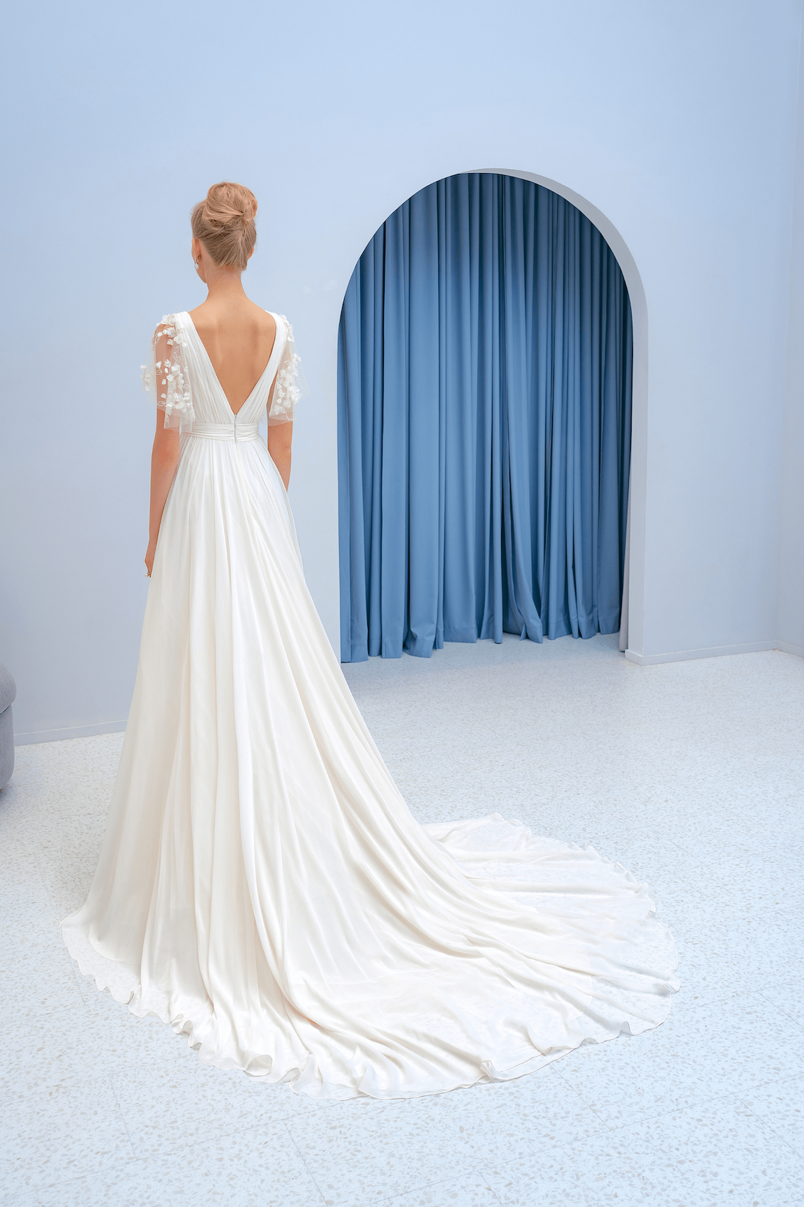 Kısa kollu işlemeli derin dekolteli yırtmaçlı nikah elbisesi