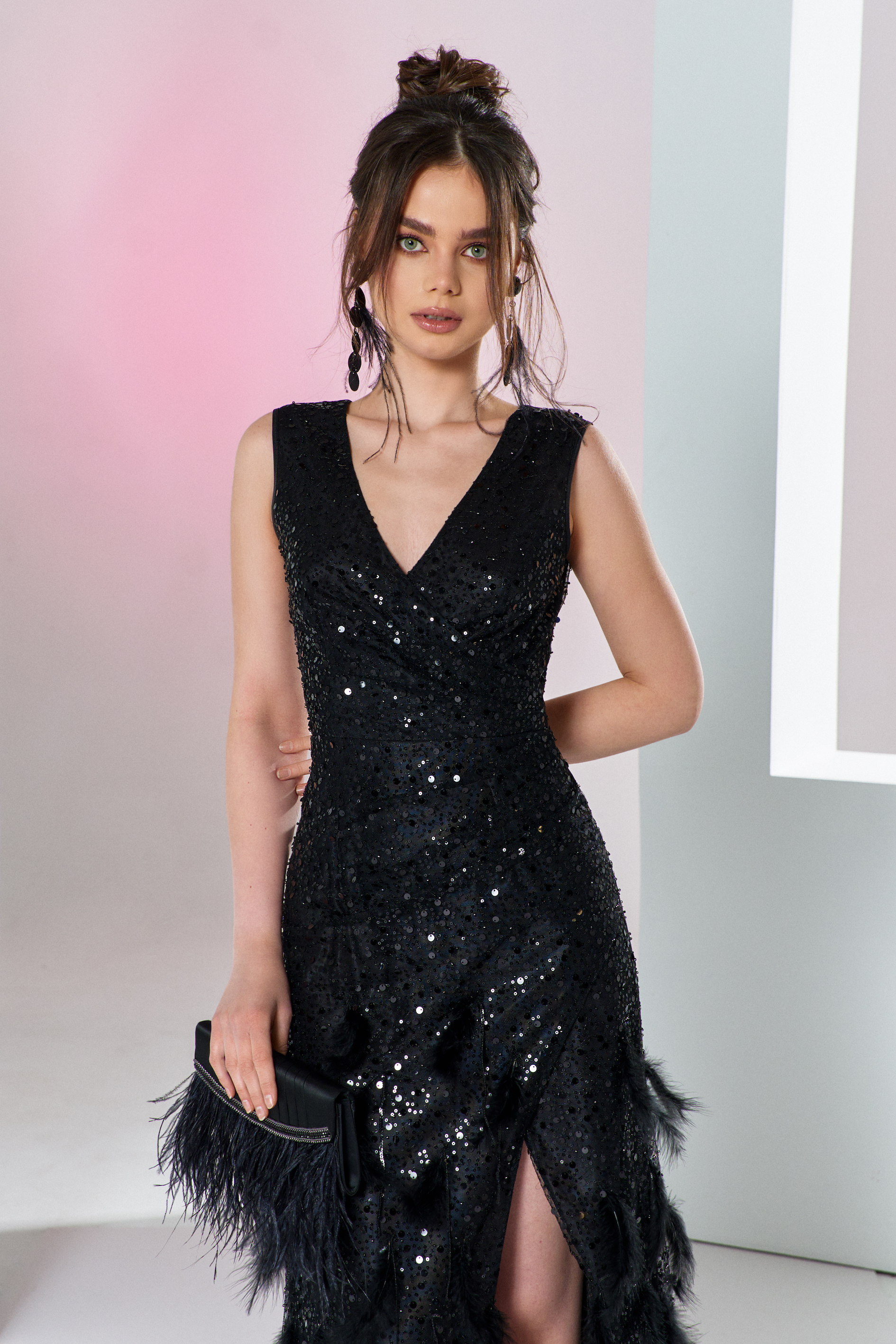 Tüylü siyah parlak gece elbisesi