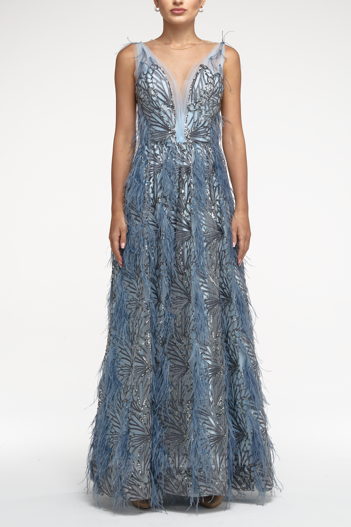 Bu ekzotik görünümlü abiye büyüleyici desenleri ile göz kamaştırıyor. İnanılmaz kelebek kanadı desenleri ve ince tüy detayları bu abiyeyi benzersiz ve özel yapıyor. Sırt kısmında çapraz bağlamalı, etek kısmının kumaşı hafif, her hareketinizde inanılmaz bir uyum sağlayıp uçuşur ve zarifliğinizi ortaya çıkartır. Özel davetlerde bu abiye severek tercih edebileceğiniz abiyemizden birtanesidir.
