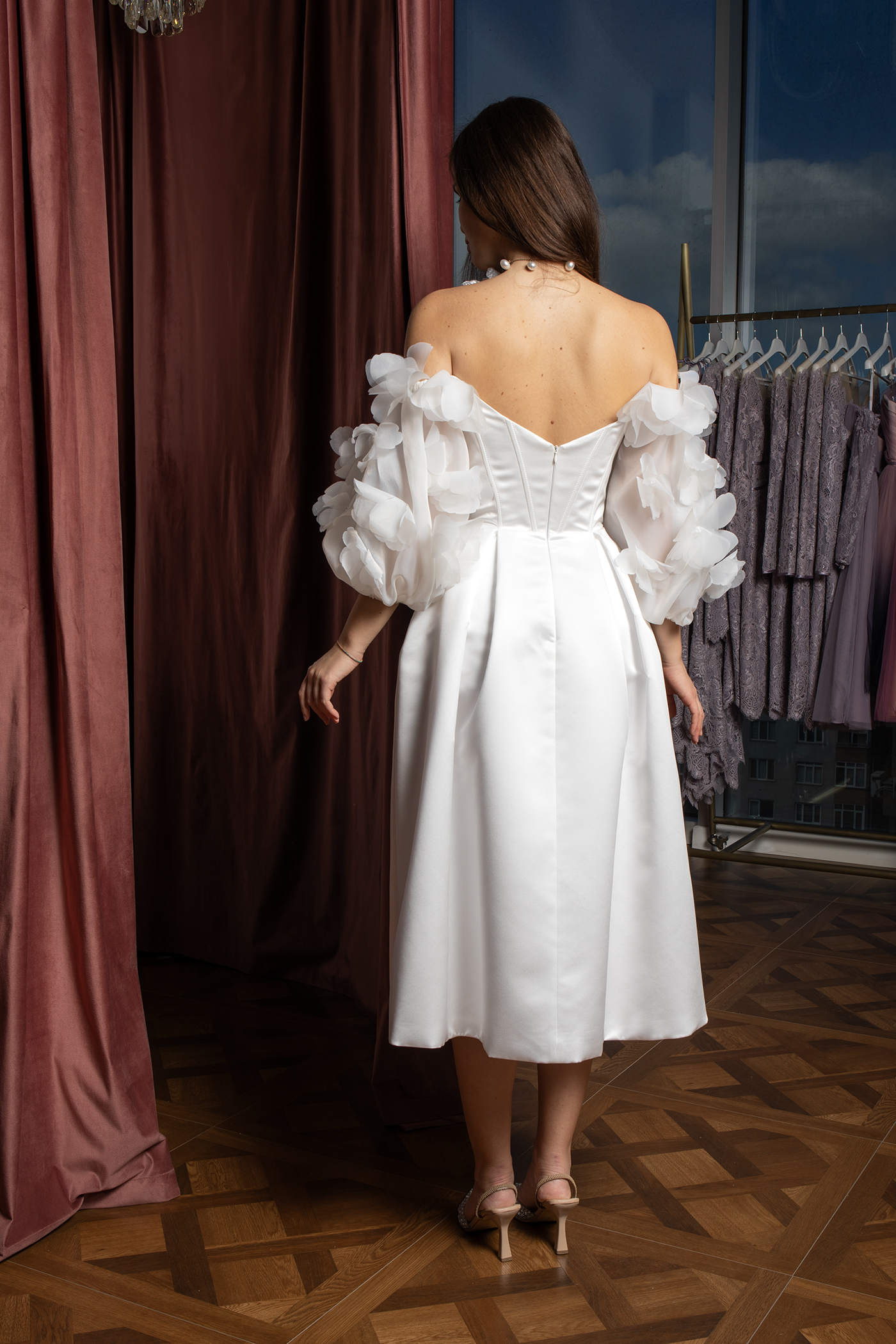 Hafif ve narin görünümlü bu tatlı midi elbise peri masalı havasını taşıyor. Üç boyutlu çiçek aplikasyonlu hacimli balon kollu korse kabarık midi etekle birleşiyor ve ortaya şık bir tasarım çıkartıyor. Bu elbise ile nişan, davet gibi özel günlerinizde daima ışıldayın!