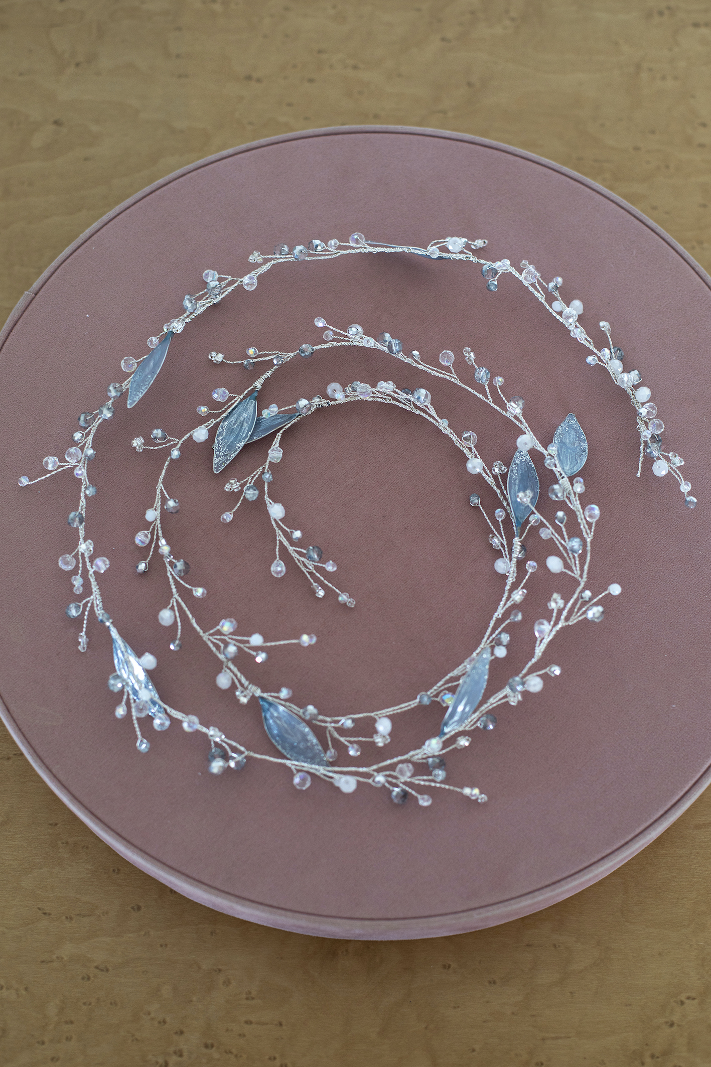 Bu toka, ince ve zarif bir el işçiliğinin ürünü olarak dikkat çekiyor. Daire formunda düzenlenmiş ince telden dalları, küçük şeffaf inci ve lacivert tonlarında yuvarlak kristallerle bezenmiş. Parlak lacıvert rengi yapraklar, doğal damar dokuları işlenerek tasarıma eklenmiş ve kıvrımlarıyla zarif bir hareketlilik katıyor, bu da onu hem özel günler hem de şık davetler için ideal bir aksesuar haline getiriyor.