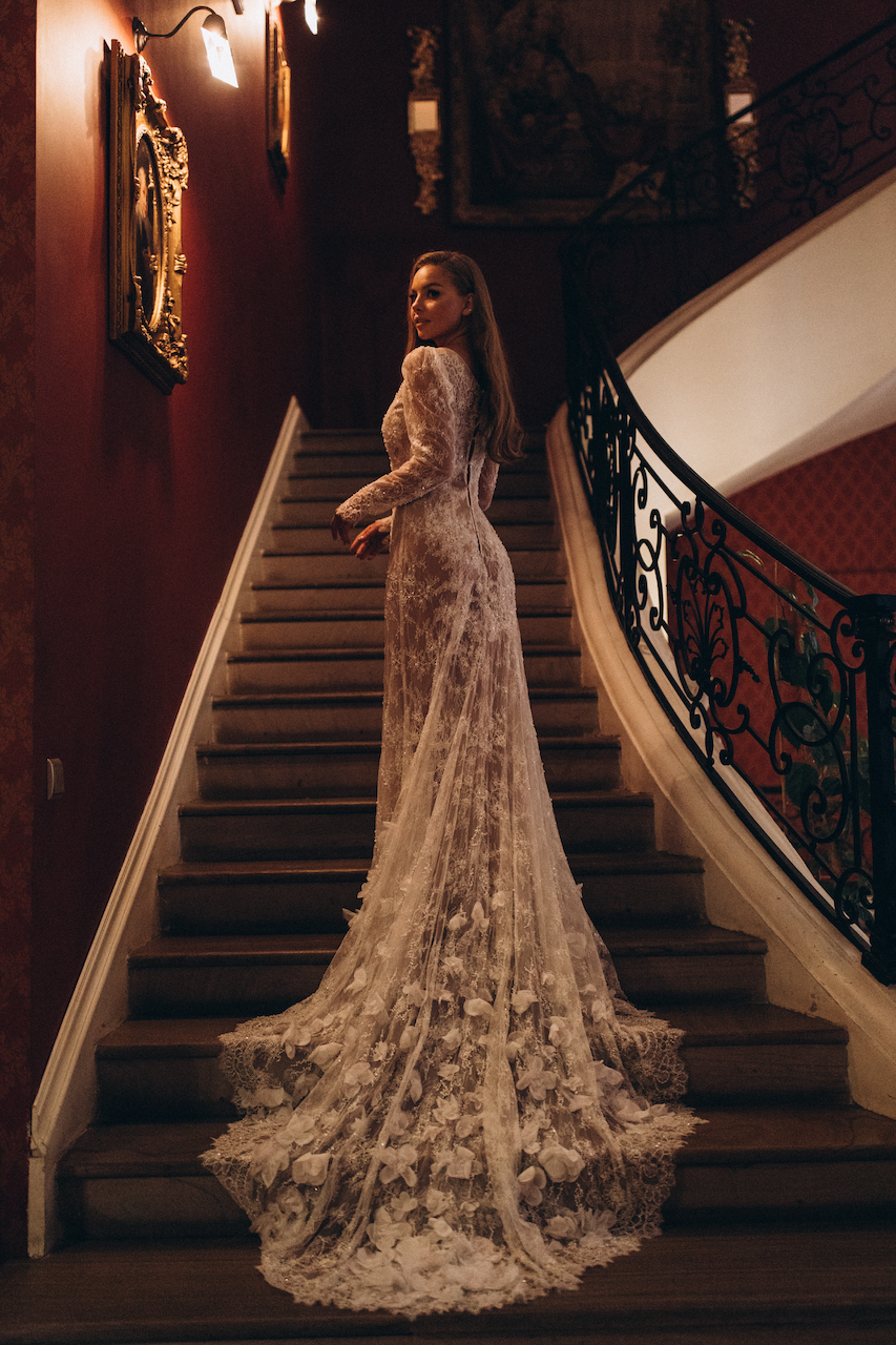 Baştan sona transparan ve romantik dantelle işlenmiş olan bu kusursuz gelinlik çekici ve iddialı duruyor. Uzun kollu ve maxi etekli olan bu eşsiz tasarımlı elbisenin büyüleyici güzelliğinizi ortaya çıkarmasına izin verin.