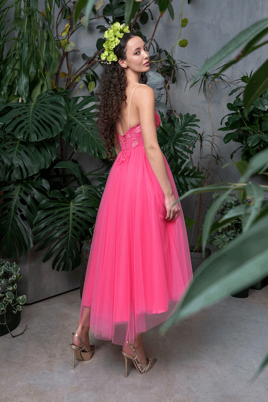İnce askılar sayesinde omuz kısmında temiz bir görüntü oluşturuyor bu da tüm dikkati ince detaylı çiçek işemeleriyle hareketlendirilmiş korsenin dekolte kısmına ve tül kumaştan oluşan romantik görünümlü eteğe çekiyor. Bu elbise ile kendinizi ultra feminen ve tüy gibi hafif hissedeceksiniz.
